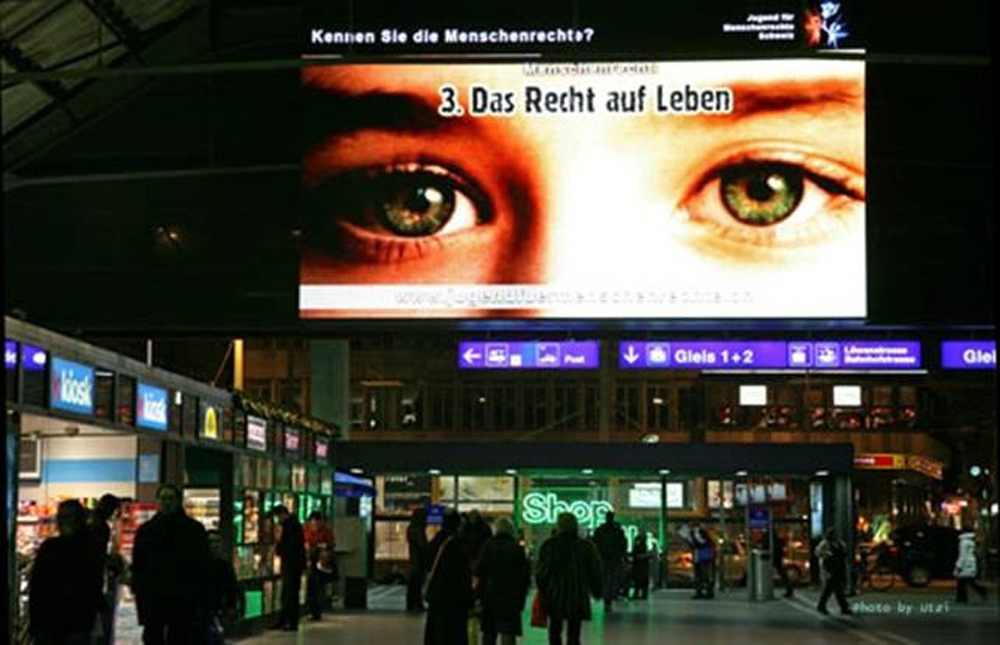 Cada cuatro minutos se pusieron al aire uno de los treinta derechos humanos de la Declaración Universal de los Derechos Humanos de las Naciones Unidas en las principales estaciones en Suiza, marcando el 60 Aniversario de la Declaración. Se han visto en pantallas gigantes en las principales estaciones ferroviarias en Zúrich, Berna, Lausana y Ginebra; estos anuncios de servicio público (PSAs) instruyeron sobre los derechos humanos a los espectadores 1.500 veces en un día.