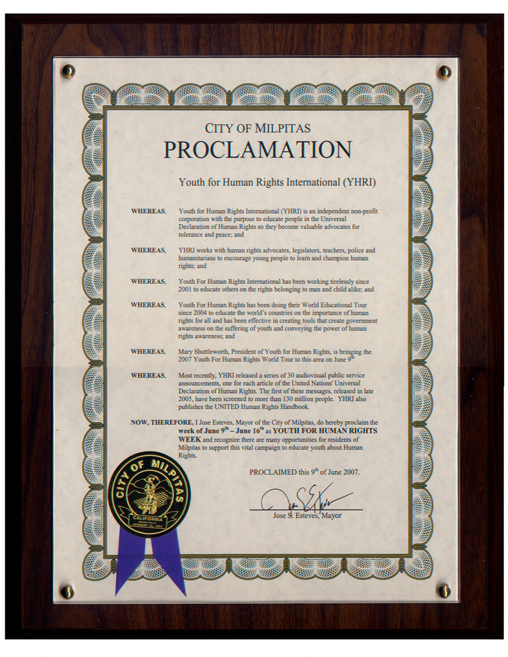 政府官員、教育人士、宗教領袖和人權倡導者,肯定YHRI工作成果的價值。YHRI在全世界的人權推廣工作,獲得了許多的獎項、表揚與肯定,在此列出其中一些: